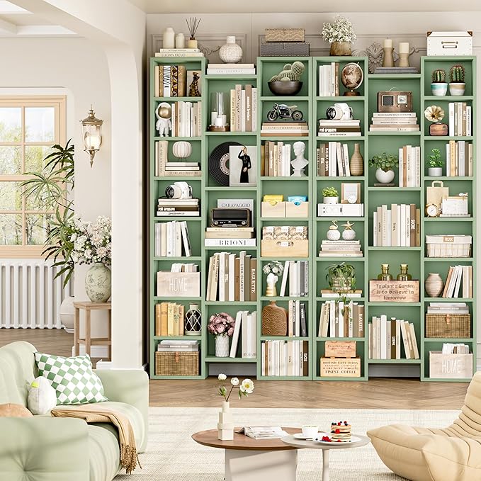 FOTOSOK 71'' Tall Bookshelf, Triple Wide Bookshelf with Adjustable Shelves, 8 Tier Media CD DVD Storage Tower Rack, Diaplay Cabinet Shelf, Cube Storage Organizer Shelf for Home Office, Green