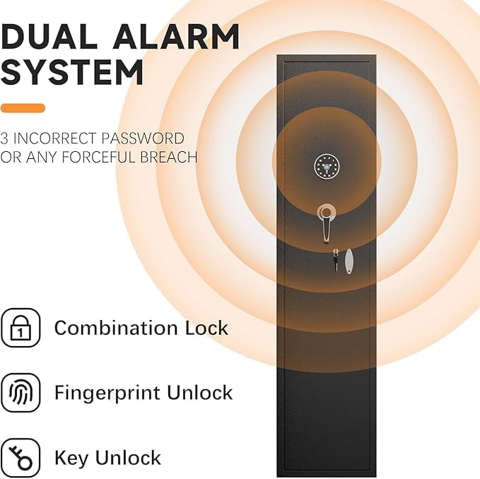 - 【Alarm System】Greenvelly gun cabinets for rifles and shotguns has a reliable alarm device, which provides you with double security and greatly improves the safety of gun storage. Adopting intelligent sensor technology, once the illegal opening is detected, the rifle safe will immediately trigger a high pitch alarm. This can effectively prevent children from touching the guns.