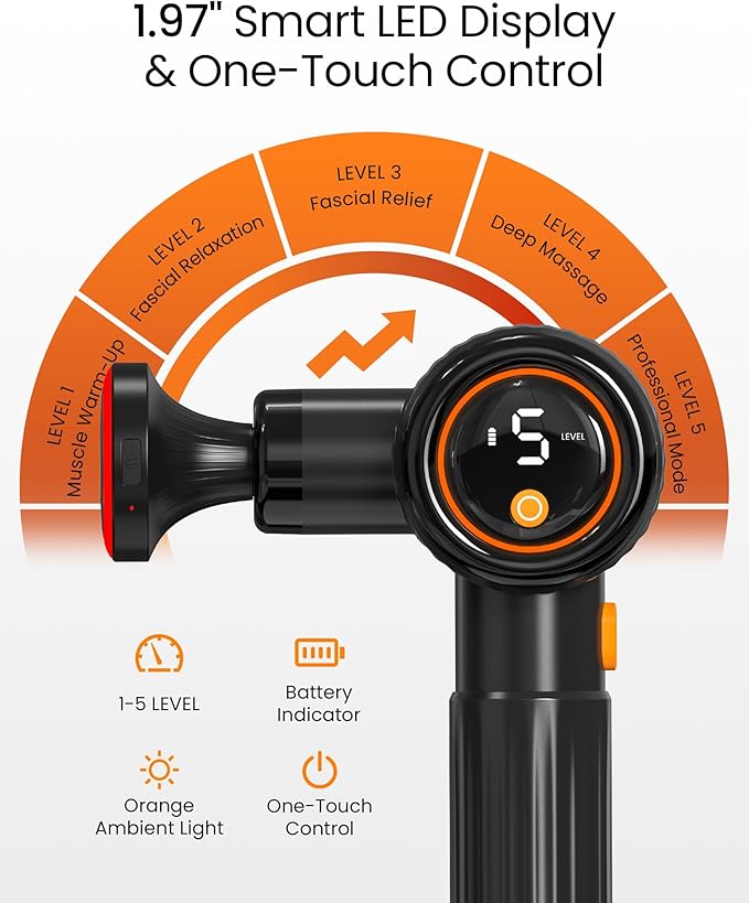 - 【Smart LED Display & One-Touch Control】The Napre massager gun is equipped with a 1.97-inch smart LED display that shows real-time speed and battery level. This muscle massager offers simple one-touch operation for turning on/off and adjusting its 5 speed levels.