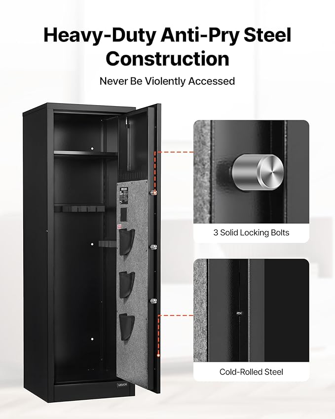 - Anti-pry Heavy-duty Cabinet: The rifle safe features a full steel construction with a 0.04 in / 1.1 mm thick anti-pry door plate, combined with 3 solid locking bolts to resist prying and damage. Pre-drilled mounting holes on the back allow for wall mounting