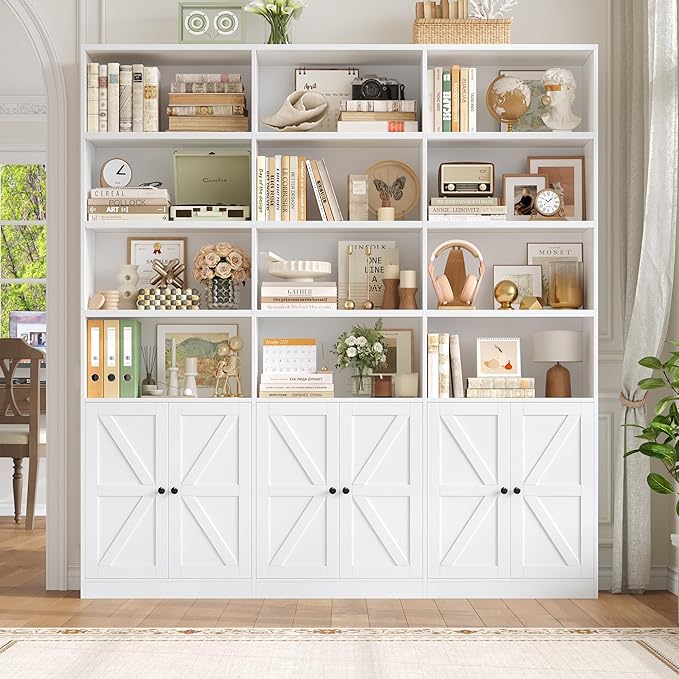 - Triple Wide Bookshelf & 6 Tiers: With 18 individual shelves and 6 enclosing doors, this tall bookshelf cleverly combines open and closed storage. It easily accommodates your books, photo albums, artifacts, decorative items, and more. The generous capacity allows you to create your library.