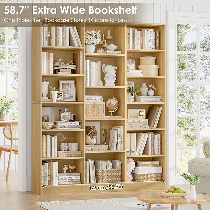 Triple Wide Bookshelf, 6 Tier Large Bookshelf, Bookcase with 17 Open Display Shelves, 74'' Tall Bookcases and Bookshelfs for Living Room, Home Office, Library, Natural