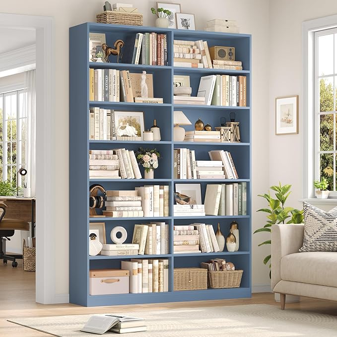 - Extra-Large Capacity Dual-Row Design: 7-tier dual-row structure with 14 individual compartments (each 11.5"D × 22.7"W × 11"H), this large bookshelf is perfect for organizing books, files, photo albums, decor, and more. Ideal for both home and office storage needs.