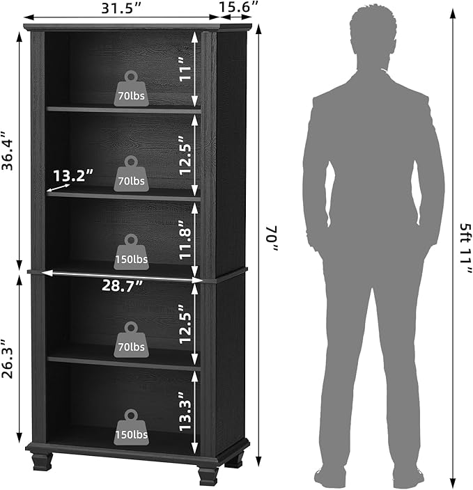 - [Large-Capacity Storage Compartments] Each storage shelf of this large book shelf is equipped with 3 adjustable heights, allowing for personalized customization according to your storage needs. The mid-century modern bookcase features 5 tier open display and storage compartments with ample space, which can easily hold a large number of books, collectibles, or storage boxes.Dimensions: 15.6"D x 31.5"W x 70"H