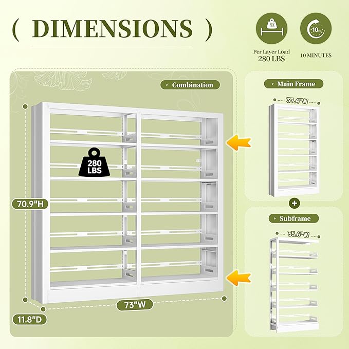 - [Spacious & Multi-Scenario Use]:With its 70.9"H tall structure and 73"W wide shelves, this 5-tier steel bookshelf offers ample storage space for your book collection, vinyl records, office files, decorative items, and more. Its sleek white finish complements any decor style, seamlessly blending into both home and commercial spaces—keeping your area organized while adding a clean, modern touch.Very suitable for use as library bookcase, office bookshelf, and home book cases, and more
